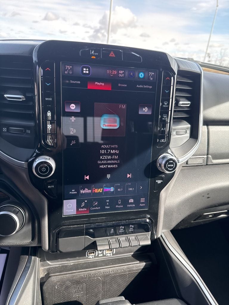 Big Horn Level 2 Equipment Group (115V Auxiliary Power Outlet, 115V Auxiliary Rear Power Outlet, 12 Touchscreen Display, 2nd Row In Floor Storage Bins, 400W Inverter, 4G LTE Wi-Fi Hot Spot, 9 Amplified Speakers w/Subwoofer, Air Conditioning ATC w/Dual Zone Control, Apple CarPlay, Auto Power-Folding Mirrors, Auto-Dimming Exterior Driver Mirror, Auto-Dimming Rear-View Mirror, Black Exterior Mirrors, Black Premium Power Mirrors, Cluster 7.0 TFT Color Display, Configurable Drive Mode, Connected Travel & Traffic Services, Connectivity - US/Canada, Convex Wide-Angle Exterior Mirror Insert, Exterior Mirrors Courtesy Lamps, Exterior Mirrors w/Heating Element, Exterior Mirrors w/Supplemental Signals, Glove Box Lamp, Google Android Auto, GPS Antenna Input, GPS Navigation, HD Radio, Heated Front Seats, Heated Steering Wheel, Integrated Voice Command w/Bluetooth®, Leather Wrapped Steering Wheel, LED Dome Lamp w/On/Off Switch, LED Footwell Lighting, Media Hub w/2 Charge Only USBs, Overhead LED Lamps, Power 2-Way Driver Lumbar Adjust, Power Adjust 8-Way Driver Seat, Power Adjustable Pedals, Premium Overhead Console, Radio: Uconnect 5 Nav w/12.0 Display, Rear Power Sliding Window, Rear Window Defroster, Remote Tailgate Release, Security Alarm, SiriusXM w/360L, Steering Wheel Mounted Audio Controls, Sun Visors w/Illuminated Vanity Mirrors, Universal Garage Door Opener, and USB Host Flip), Quick Order Package 21Z Big Horn, 3 Rear Seat Head Restraints, 4 Way Front Headrests, 4-Wheel Disc Brakes, 6 Speakers, ABS brakes, Air Conditioning, Alloy wheels, AM/FM radio, Apple CarPlay/Android Auto, Auto High-beam Headlights, Brake assist, Bumpers: chrome, Cloth Bench Seat, Compass, Delay-off headlights, Driver door bin, Dual front impact airbags, Dual front side impact airbags, Electronic Stability Control, Front anti-roll bar, Front Center Armrest w/Storage, Front fog lights, Front License Plate Bracket, Front reading lights, Front Seat Back Map Pockets, Front wheel independent suspension, Fully automatic headlights, Heated door mirrors, Illuminated entry, Low tire pressure warning, Manual Adjust 4-Way Front Passenger Seat, Manual Folding Exterior Mirrors, Manufacturer's Statement of Origin, Occupant sensing airbag, Outside temperature display, Overhead airbag, Overhead console, Panic alarm, ParkView Rear Back-Up Camera, Passenger door bin, Passenger vanity mirror, Power door mirrors, Power steering, Power windows, Radio data system, Radio: Uconnect 5 W w/8.4 Display, RAM Grille Badge - Chrome, Rear 60/40 Folding Seat, Rear anti-roll bar, Rear seat center armrest, Rear step bumper, Remote keyless entry, Speed control, Split folding rear seat, Supplier Part Tracking (J-1), Tachometer, Telescoping steering wheel, Tilt steering wheel, Traction control, Trip computer, Variably intermittent wipers, Voltmeter, and Wheels: 18 x 8 Cast-Aluminum Painted.